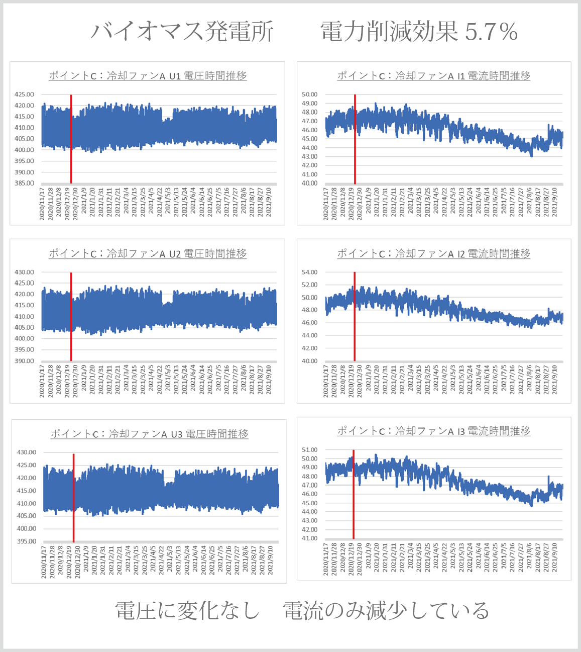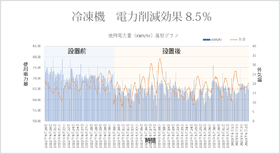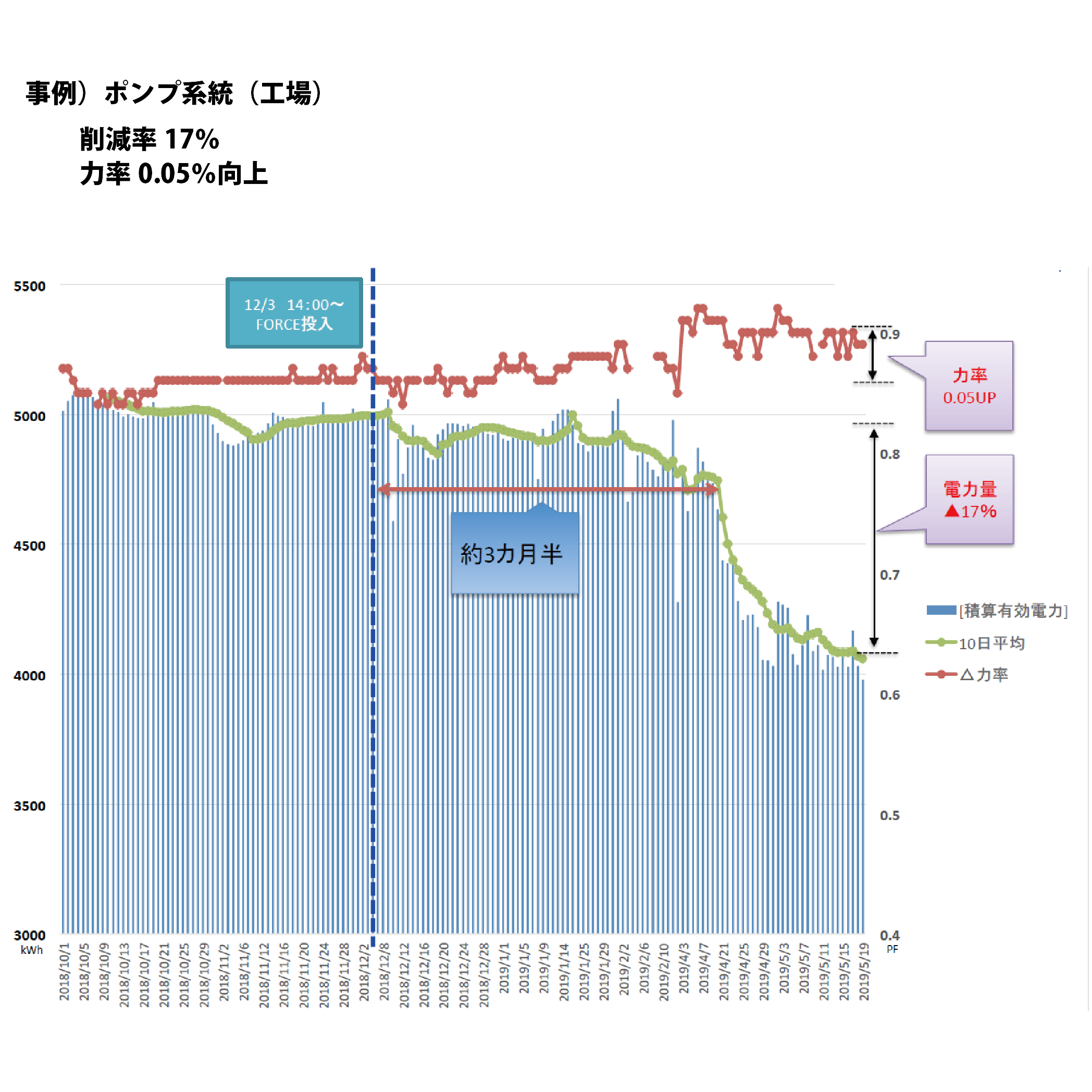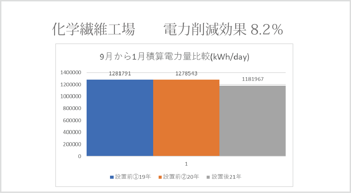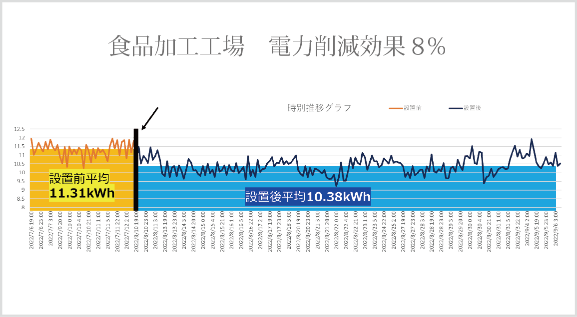 FORCEの国内事例 日本国内での設置事例の一例をご紹介 FORCEにより8.2%電力削減 同じ生産量の機関での比較 FORCEにより8%電力削減 FORCEにより10%電力削減 年末年始の待機電力での比較 FORCEにより8.5%電力削減 FORCEにより5.7%電力削減 電圧に変化がなく電流値が減少しております。 FORCEにより最大17%電力削減 年平均10%電力削減